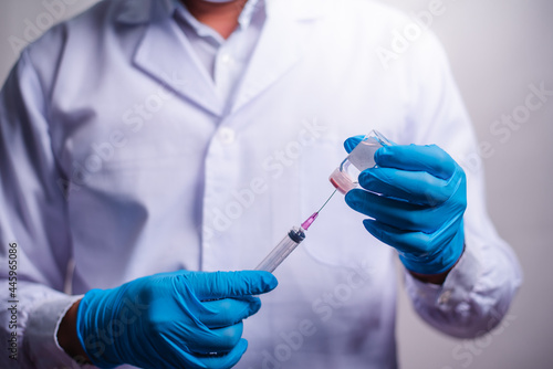 Doctor holding tube with Coronavirus vaccine and syringe. Healthcare And Medical concept.