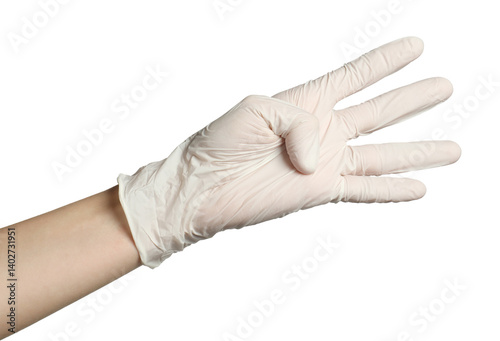 Doctor in medical glove showing four fingers on white background, closeup