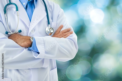 Doctor in uniform holding stethoscope and crossed arms. Hospital or clinic background and copy space