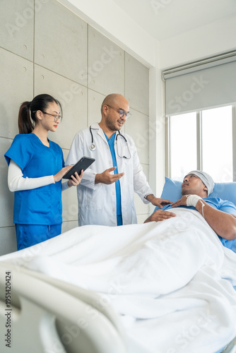 Doctor team visiting man cancer patient with care and compassion in hospital room. Oncology support medical consultation healthcare and hope. Doctor reporting medical test results to the patient