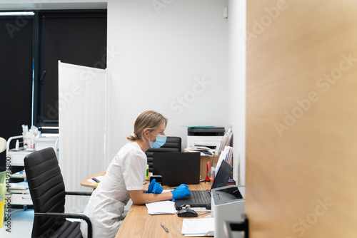 adult, alone, apparel, care, caucasian, chair, clinic, coat, computer, desk, device, doctor, face, face mask, female, gynaecologist, happy, health care, health care, labcoat, laptop, looking, medicals, medicare, medication, medicine, 1, pandemic, person, professional, room, service, sitting, table, using, white, woman, men at work, working