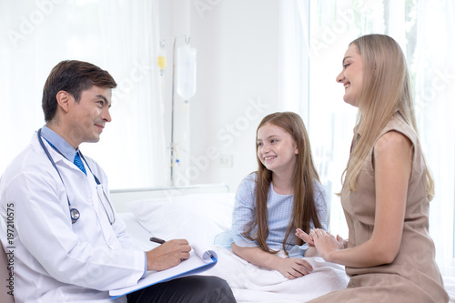 Doctor visit to little patient at hospital with happy emotion together. People with health care and medical concept.