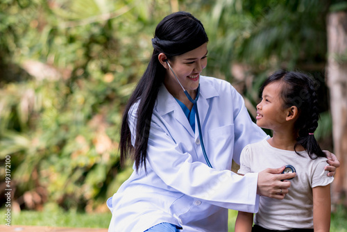 doctor woman with little girl in park.