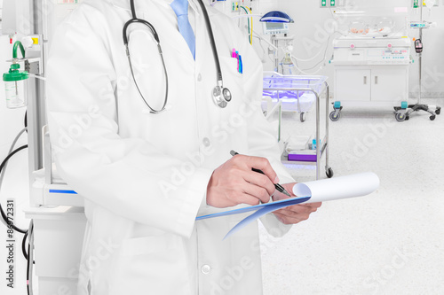 Doctor writing a medical prescription in delivery room