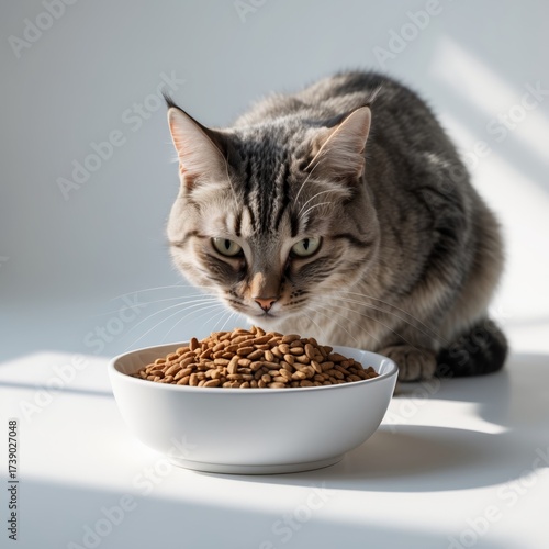 cat, food, bowl, pet, domestic, animal, eating, meal, fur, tabby, nourishment, closeup, studio, white, light, realistic, portrait, texture, healthy, brown, grain, dry, isolated, looking, curious, ravenous, feeding, paw, whisker, eye, ear, petfood, surface, shadow, clean, elegant, pose, composition, side, view, background, soft, felino, mammal, small, striped, house, playful, adorable
