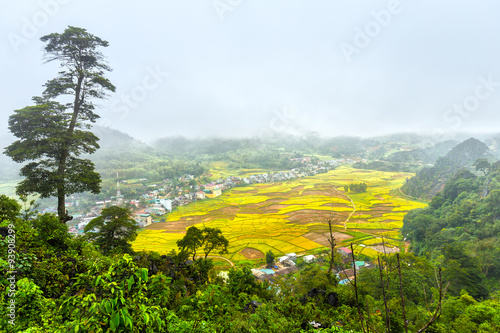 Dong Van town harvest the paddy fields are ripe rice with yellow carpet looms when the clouds looming over the hilltop real peace