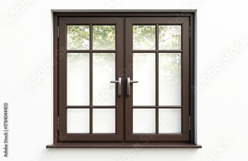 Double brown window on white wall exterior. Modern home facade design. Glass panes with window handles. Exterior view architectural details. Building exterior photo.