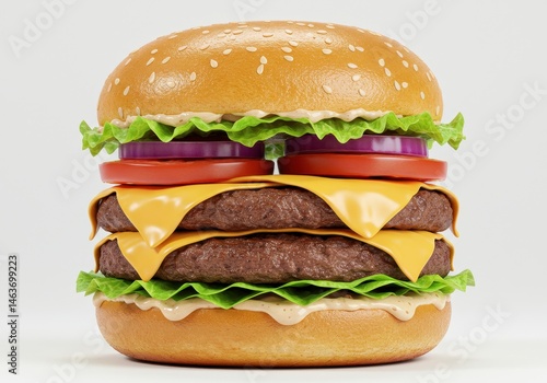 Double cheeseburger with lettuce tomato and onion on a sesame seed bun isolated