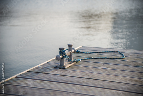 Double cross bollard or bitteng with a tied rope on the dock. towing mooring gear