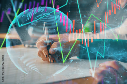 Double exposure of forex chart drawing over people taking notes background. Concept of financial analysis