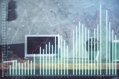 Double exposure of forex graph and work space with computer. Concept of international online trading.