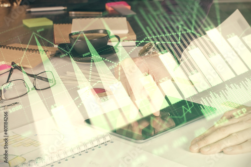 Double exposure of man's hands holding and using a digital device and forex graph drawing. Financial market concept.