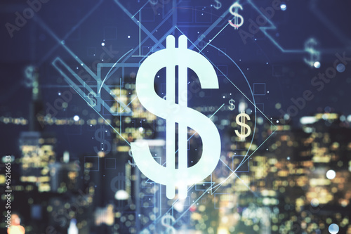 Double exposure of virtual USD symbols hologram on blurry cityscape background. Banking and investing concept