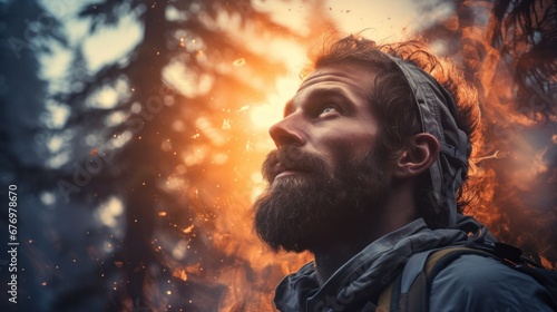 Double exposure photography of close up traveller and the tranquil forest, nature, adventure, forest, man, hiking, backpack, young, lifestyle, tourist, outdoors.