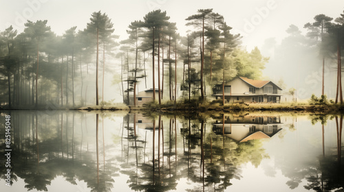 relaxation, retreat, forest, double exposure, double, exposure, white background, white, background, created, ai, generative, lake, water, fog, landscape, nature, morning, river, mist, sky, tree, winter, tree, sunrise, autumn, foggy, duck pond, snow, calm, cold, scenery, misty, blue, sun, bungalow, building, home