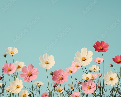 Down bright comforting concept, Colorful Cosmos Flowers Against a Soft Blue Sky Background