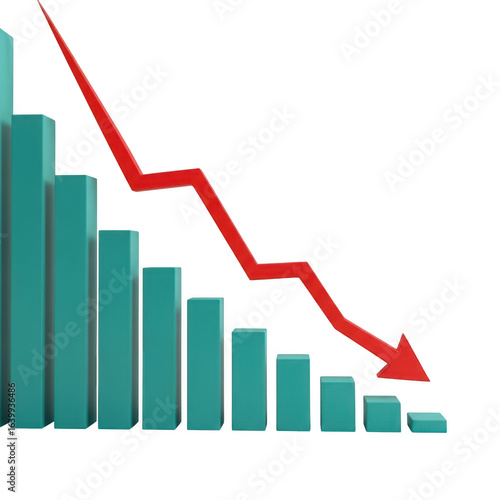 Downward trending bar chart with red arrow indicating decline isolated on transparent background