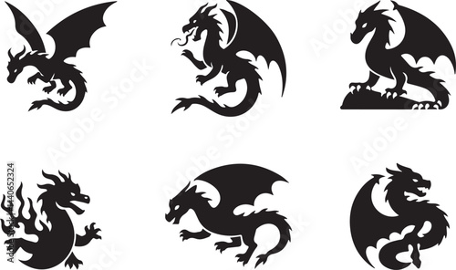 Dragon Silhouette Icons Collection in Black Vector Style for Fantasy, Mythology, and Creature Designs