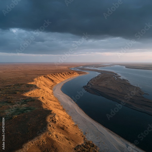 river, delta, aerial, landscape, sunset, cliff, beach, water, nature, scenery, dramatic, cinematic, lighting, shadow, texture, high contrast, soft light, serene, peaceful, calm, huge, expansive, open, space, sky, cloud, earth, geology, geography, wilderness, remote