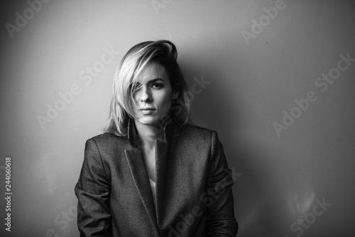 Dramatic black and white portrait of a beautiful woman on a dark background