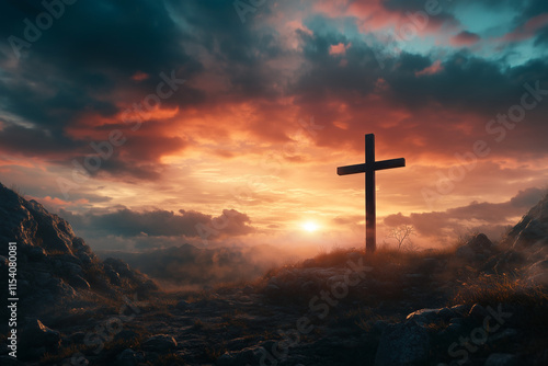 Dramatic Christian Cross at Sunset with Dark Clouds and Sunbeams Depicting Resurrection and Easter Spirituality