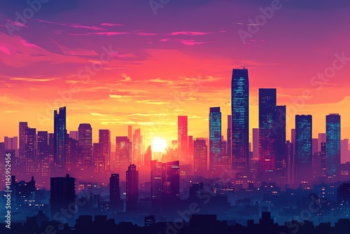 dramatic cityscape at sunset with skyscrapers silhouetted against vibrant skies minimalistic urban scene with copy