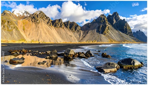 Dramatic coastal landscape showcases majestic mountains with snow-capped peaks, alongside a black sand beach with large, weathered rocks reflected in the wet sand under a vibrant blue sky and...