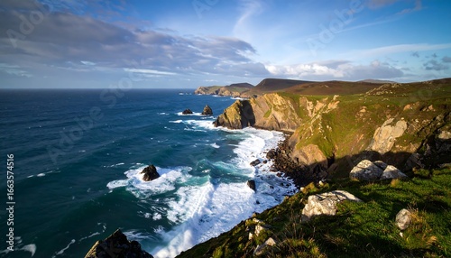 coast, ocean, wave, rock, cliff, hill, green, blue, sky, cloud, landscape, nature, scenery, sunlight, dramatic, water, view, travel, vacation, tour tourism, beautiful, high-coloured, colourful, seascape, rugged, wild, expansive, bright, creative, modern, elegant, stylish, professional, decorative, vibrant, stunning, amazing, marvellously, fantastic, gorgeous, lovely, charming, attractive, impressive, spectacular