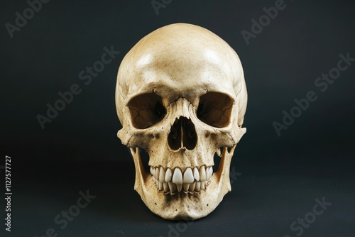 Dramatic Front View of a Natural Human Skull Against a Stark Black Background