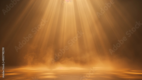Dramatic golden brown spotlight beams through atmospheric haze. Background with empty copy space. Generative AI