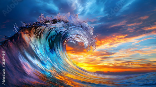 Dramatic Ocean Wave Splashing Against Fiery Sunset Sky with Vibrant Blue and Orange Tones