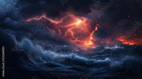 storm, sea, lightning, rain, dark, wave, sky, ocean, night, weather, intense, red, cloud, nature, power, dramatic, energy, thunder, force, element, water, violent, danger, climate, abstract, background, motion, chaos, scene, atmospheric, glow, turbulent, electrical, bright, shining, environment, outdoors, wild, tempest, stormy, landscape, visual