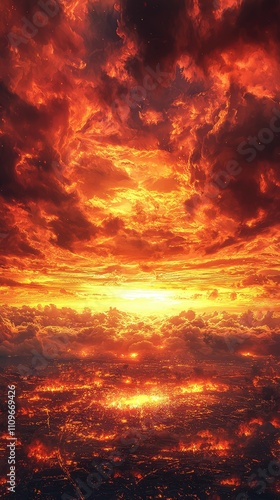 Dramatic Sunset Over a Fiery Landscape with Vibrant Clouds and Warm Tones Illuminating the Sky, Creating an Epic and Breathtaking View of Nature's Splendor