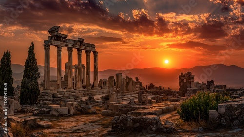 Dramatic sunset over ruins of ancient temple in Turkey, a landscape view with beautiful red sky and mountain. Concept for historical tourism, travel destination and cultural heritage