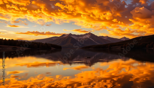 Dramatic sunset reflecting on tranquil lake with mountains, peaceful nature, Earth Day, blurred background