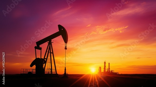 Dramatic sunset silhouette of an oil pump jack against colorful sky, symbolizing energy production and natural resources.