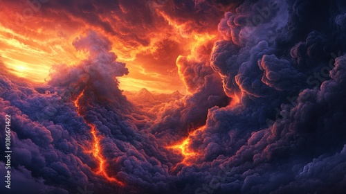 dramatic, volcanic, eruption, flowing, lava, illuminated, stunning, twilight, cloud, swirling, vibrant, colours, nature, landscape, photo, evening, atmospheric, spectacle, fiery, molten, dynamic, breathtaking, natural, scene, no people