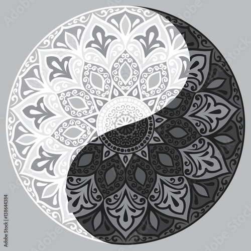 Drawing of a black and white mandala (round ethnic ornament) in shape of symbol yin yang