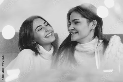 Dreamful. Portrait of beautiful brunette women in comfortable soft longsleeves on studio background, black and white. Home comfort, emotions, facial expression, winter mood concept. Friendship.
