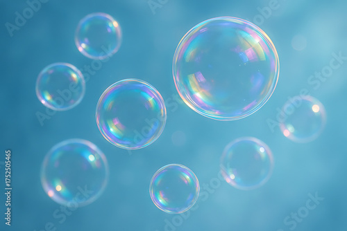 Dreamy bubble reflections in vibrant blue sky capturing whimsical simplicity of floating spheres in ethereal atmosphere. concept of tranquility, lightness, imagination.