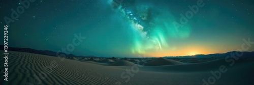 dreamy desert landscape under starry sky with glowing teal lights, golden, desert, eerie