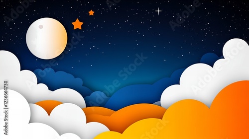 night, sky, moon, cloud, star, orange, blue, white, paper, cut, illustration, design, background, whimsical, dreamy, serene, tranquil, peaceful, colourful, vibrant, art, graphic, texture, image, pattern
