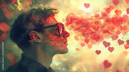 Dreamy Portrait of Man with Romantic Hearts and Roses Background