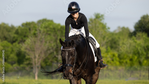 dressage, equine, horse, equestrian, riding, black, horseback, saddle, bridle, casual attire, woman, ride, rider, person, pet, pat, reward, love, friends, bond