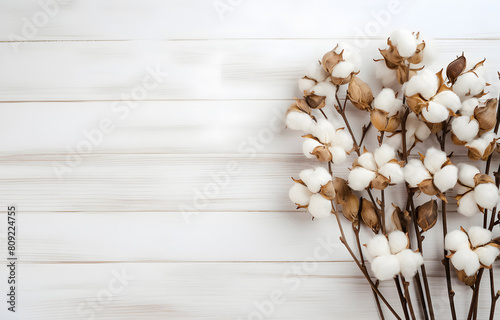 Dried fluffy cotton flower branch on white wooden table top view