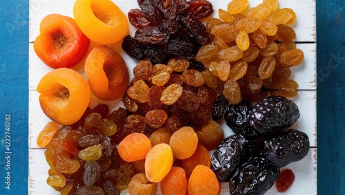 dried, fruit, assortment, apricot, grape, prune, board, white, vibrant, colours, wooden, blue, background, healthy, snack, natural, organic, food, wholesome, sweet, texture, fresh, colourful, tasty, nourishment, epicure, dessert, culinary, decor, rustic, ingredient, delicious, preserving, dry, dietary, seasonal, homestyle, arrangement, appetising, showcase, visual, freshness, fiber, rich, antioxidant