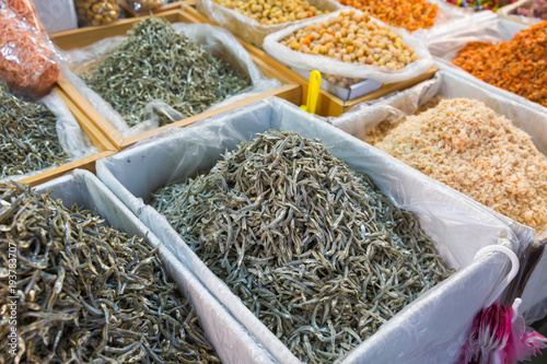 Dried small fish and shrimp in market