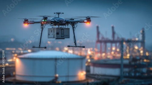 drone, delivery, cargo, industrial, port, dusk, night, shipping, technology, package, automated, transport, logistic, unmanned, aerial, transportation, futuristic, modern, future, innovation, tech, supply, chain, box, container, crane, tanker, facility, manufacturing, urban, city, equipment, machinery, infrastructure, robotic, technically, efficient, progress