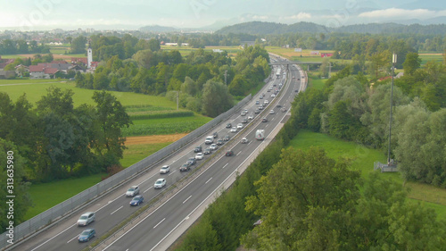 DRONE: Flying along long traffic jam formed on highway crossing the countryside