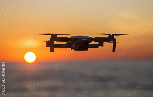 Drone flying in the sky against the backdrop of a bright sunset. Radio-controlled quadcopter with a video camera for observing and filming nature.